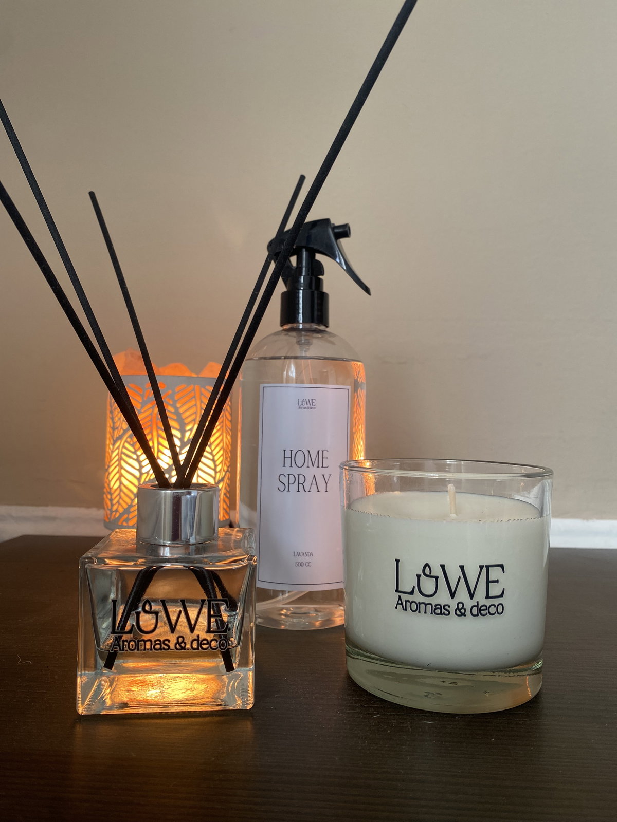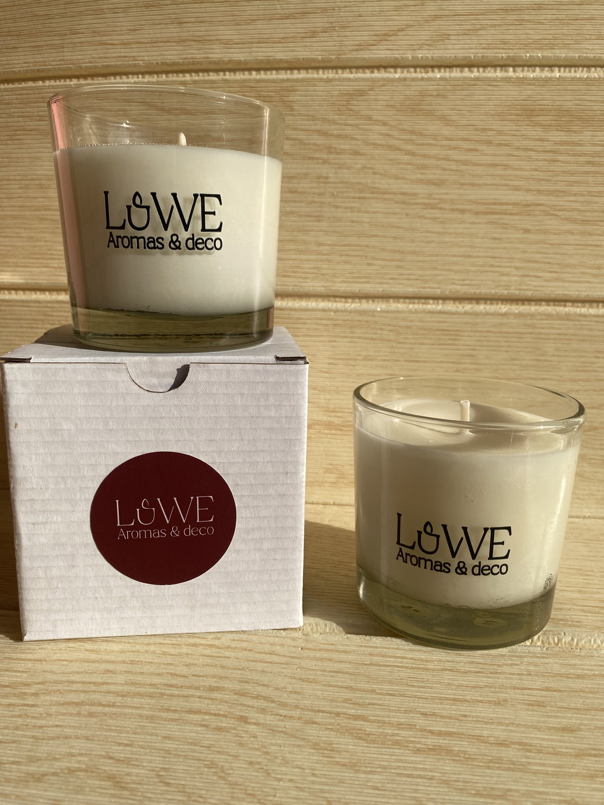 Vela de cera de soja aromática en recipiente de vidrio cristal reutilizable.