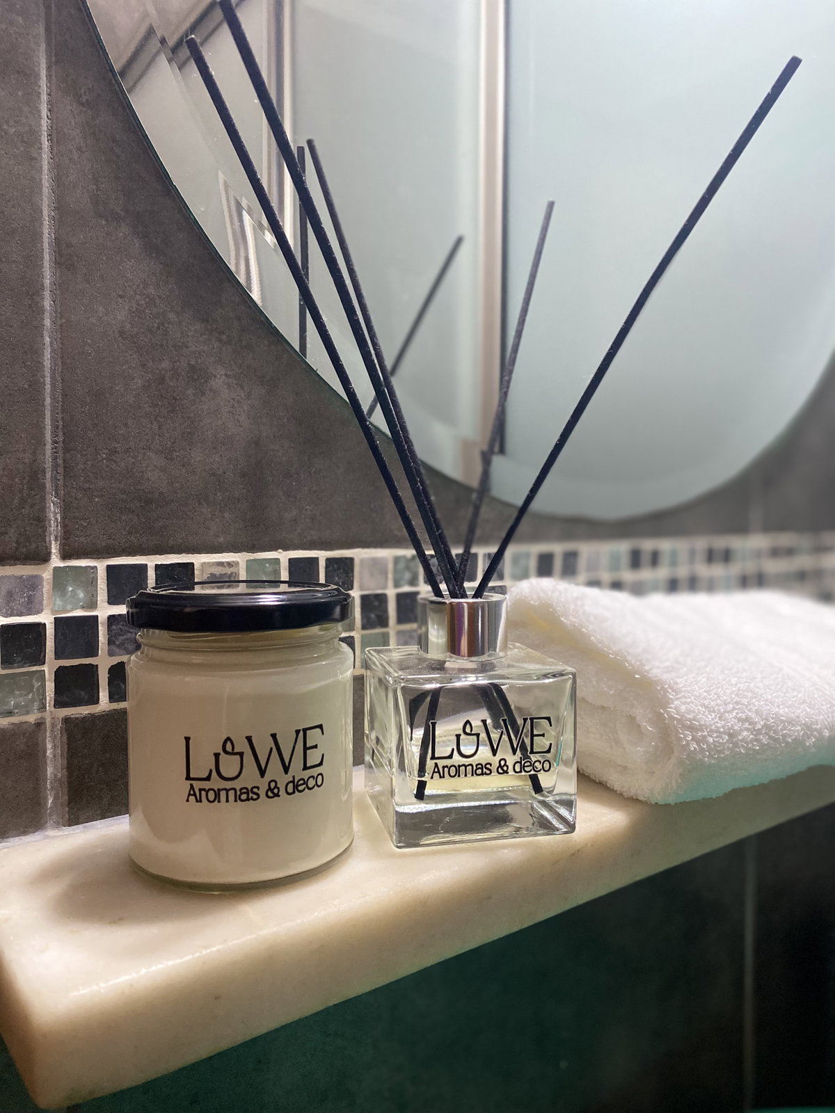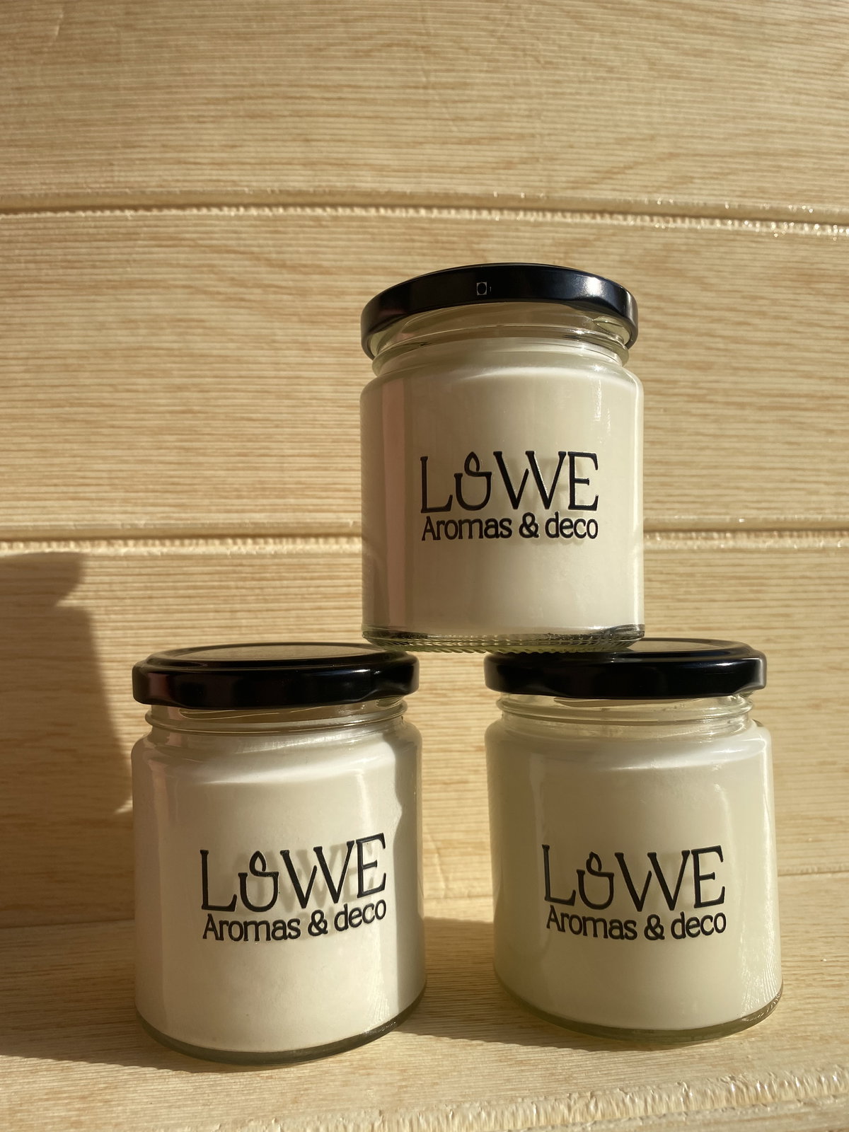 Vela de cera de soja aromática en envase de vidrio con tapa negra.