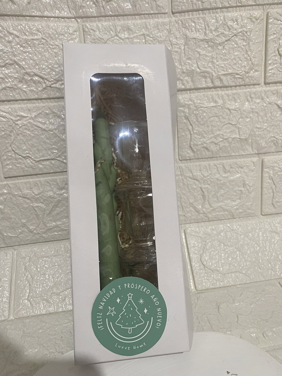 Box navideño candelabro x3 velas + 3 candelabros de vidrio.
