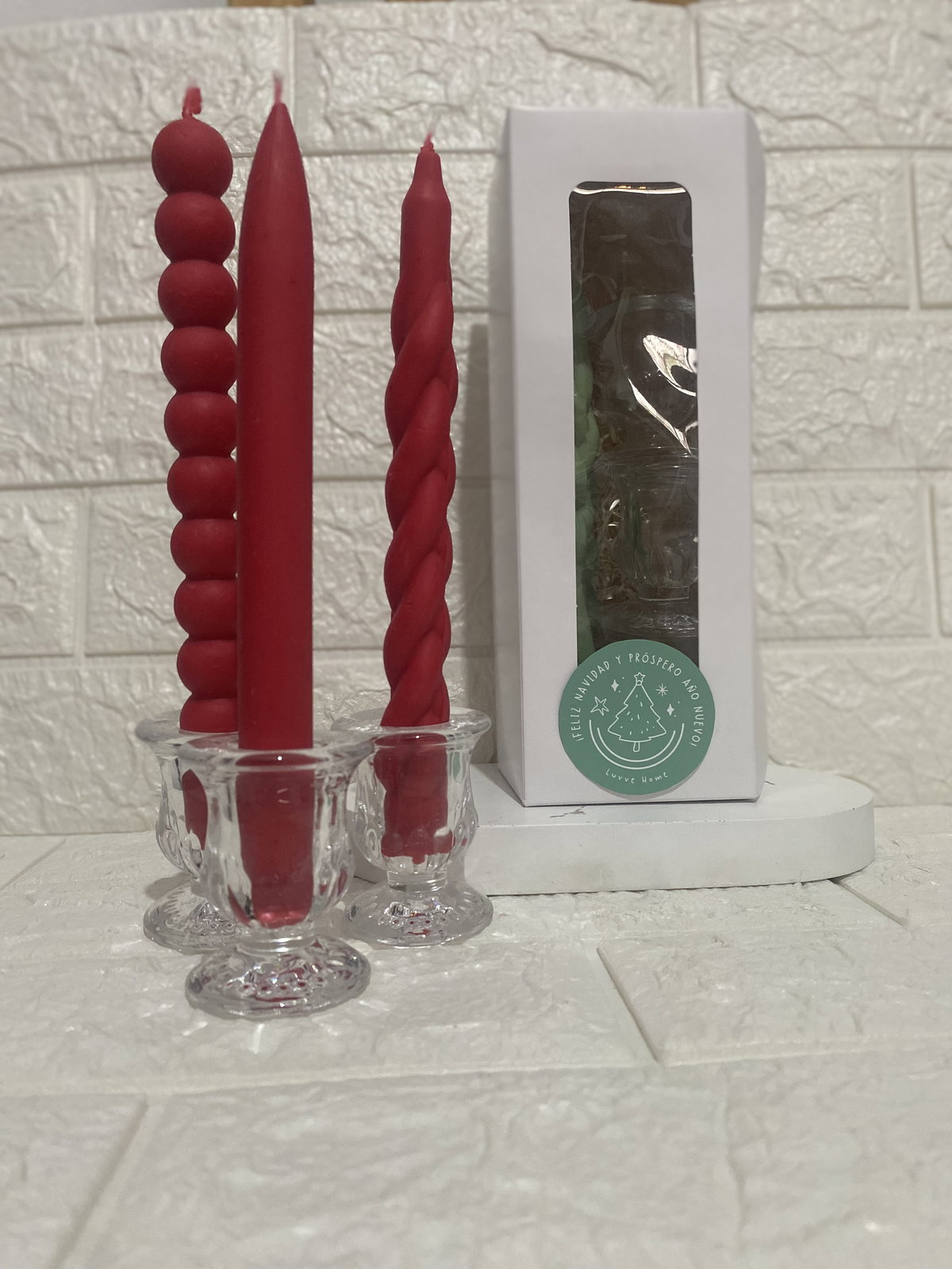 Incluye: vela candelabro bolita, vela candelabro lisa, vela candelabro torzada y 3 candelabros de vidrio de 6x5 cm.
