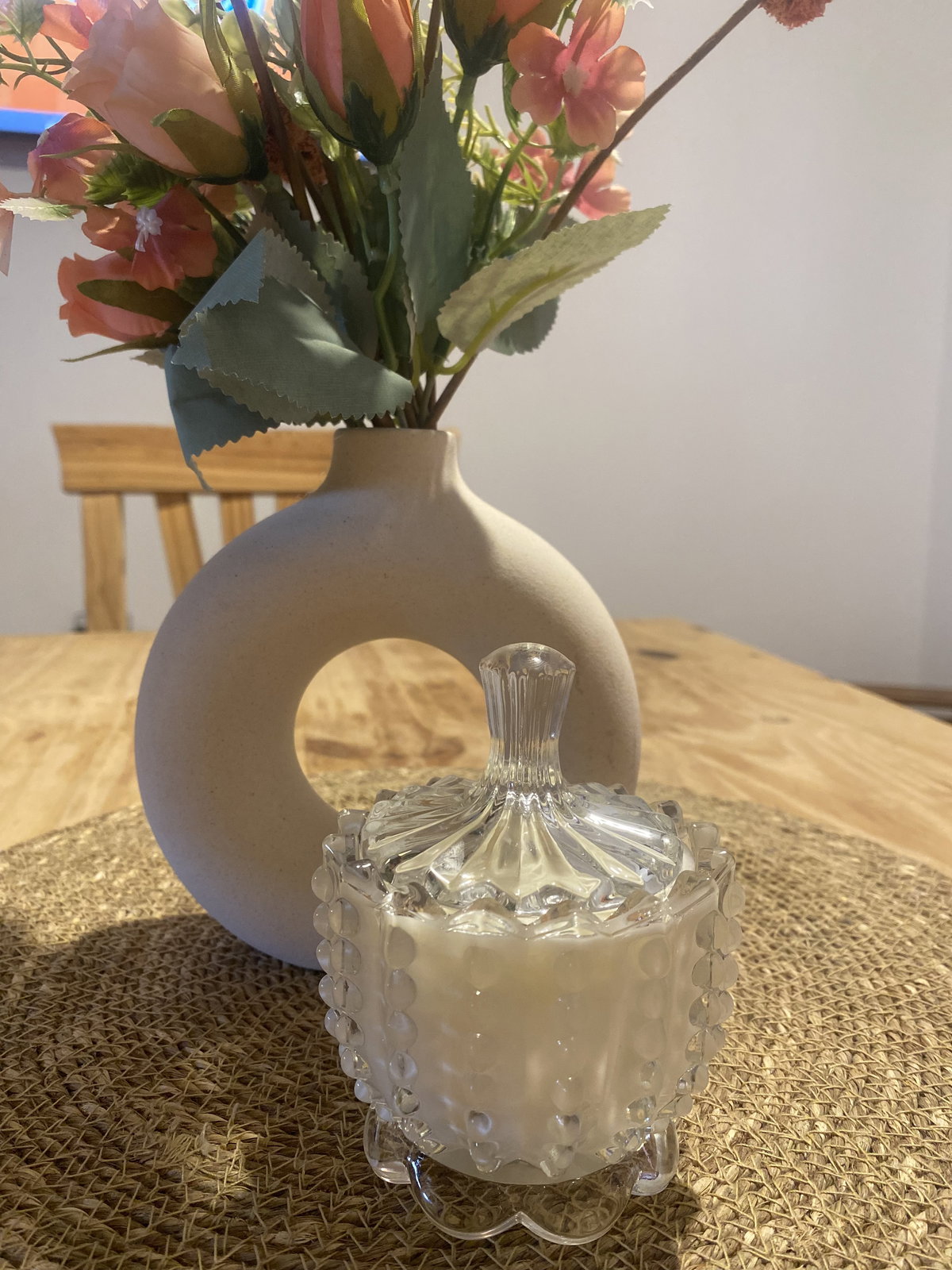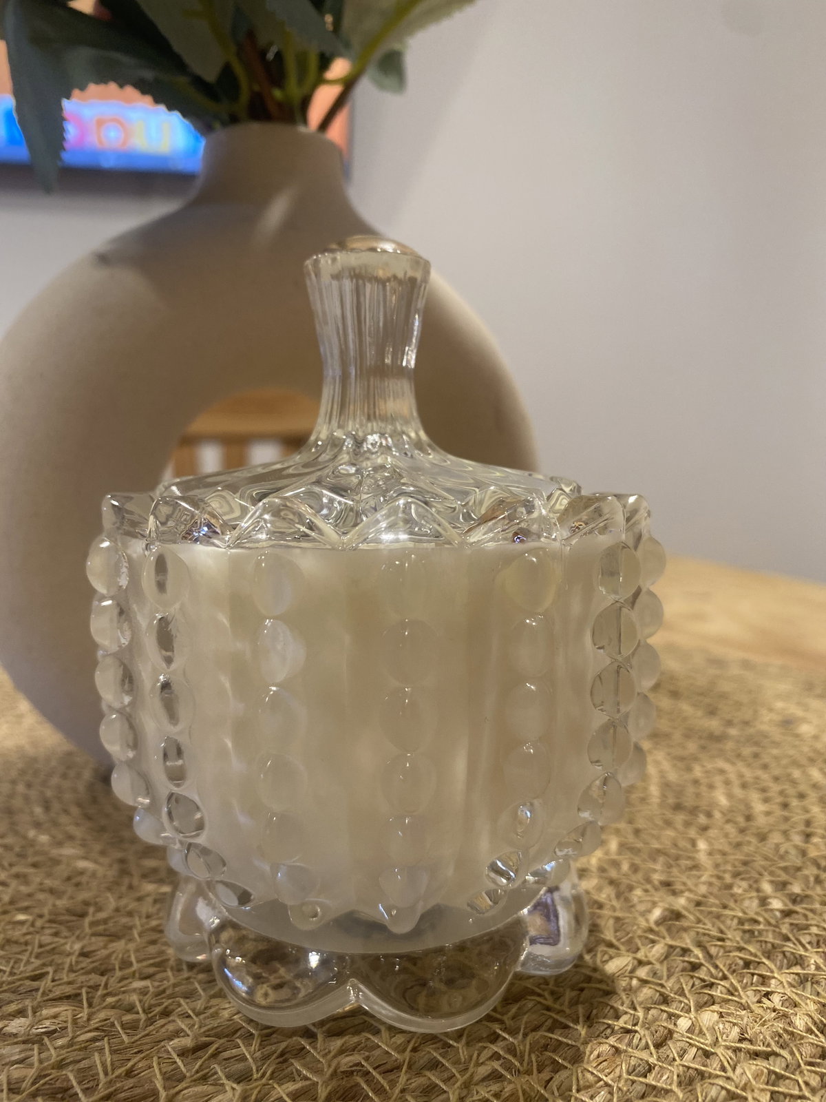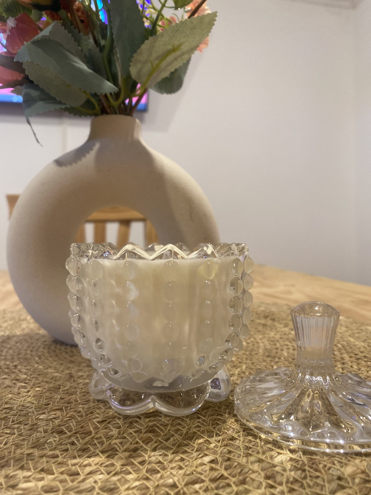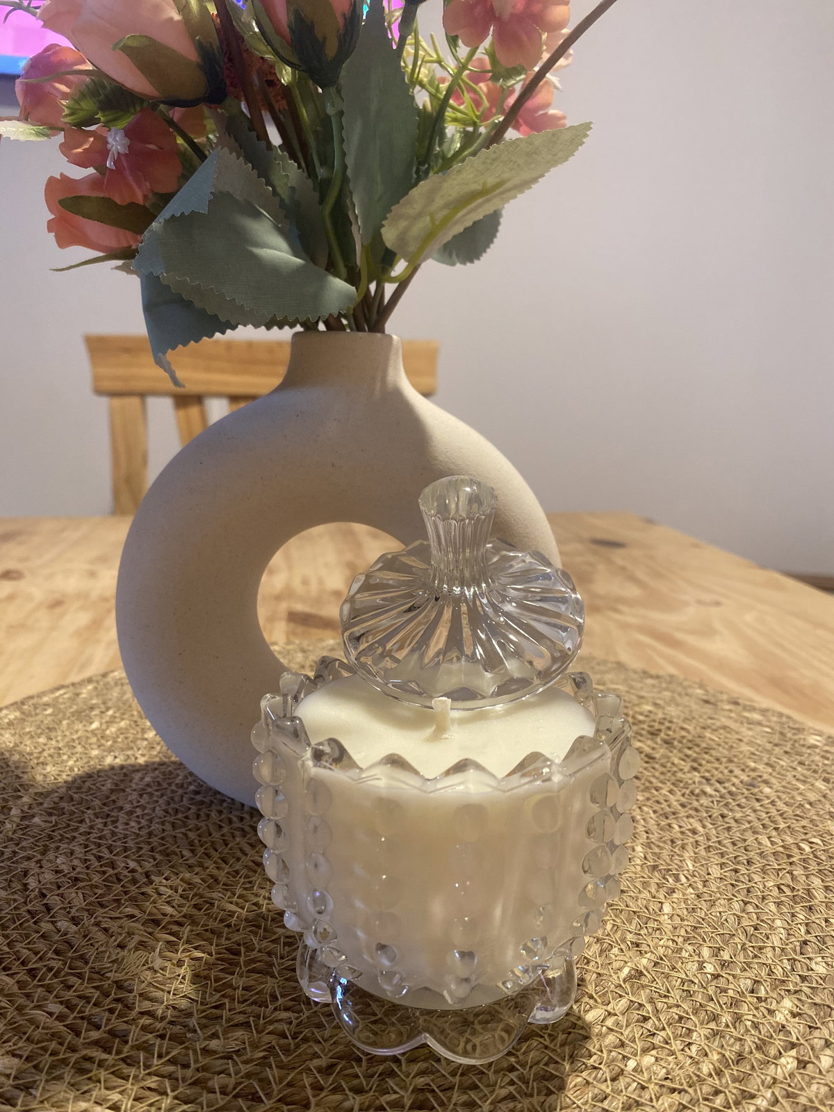 Vela de cera de soja aromática en caramelera de vidrio tramada. Tamaño: 11x8 con tapa