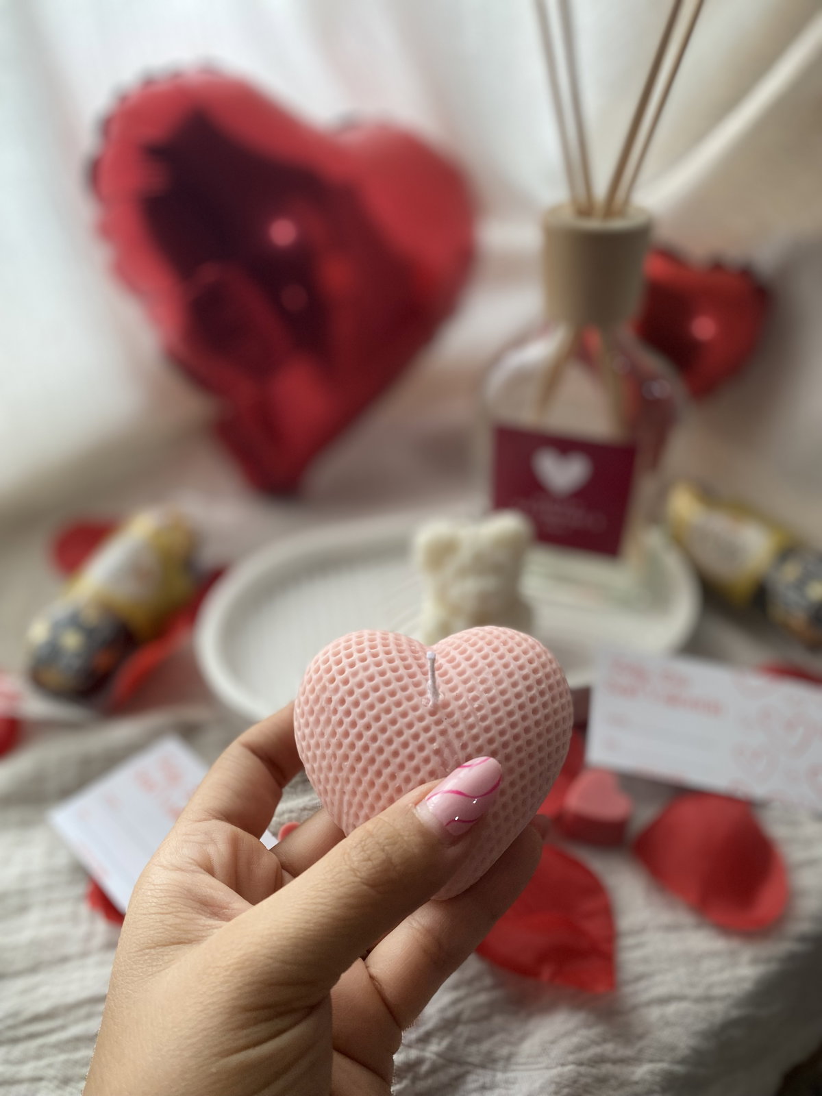 🎀 Vela aromática en forma de corazón.